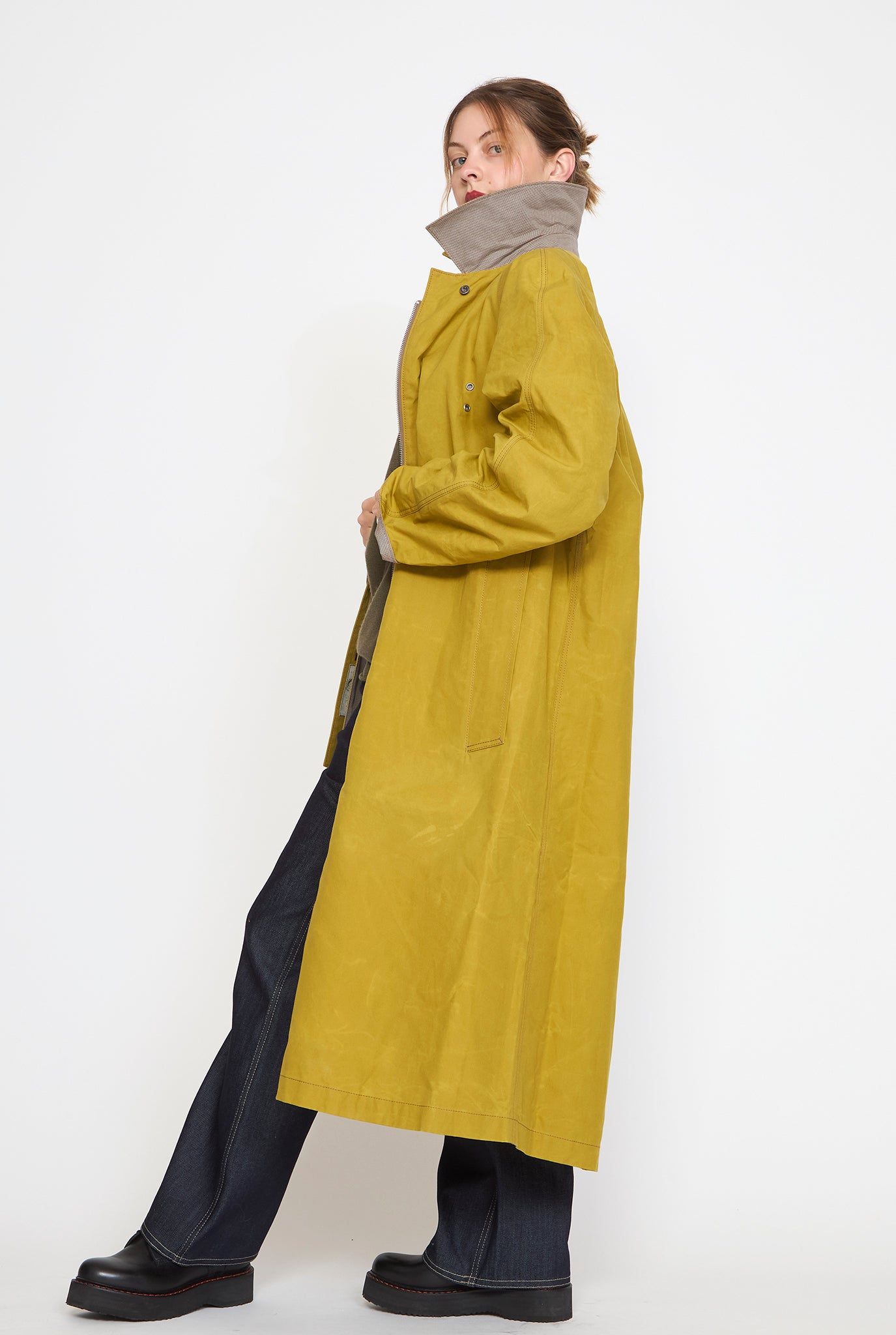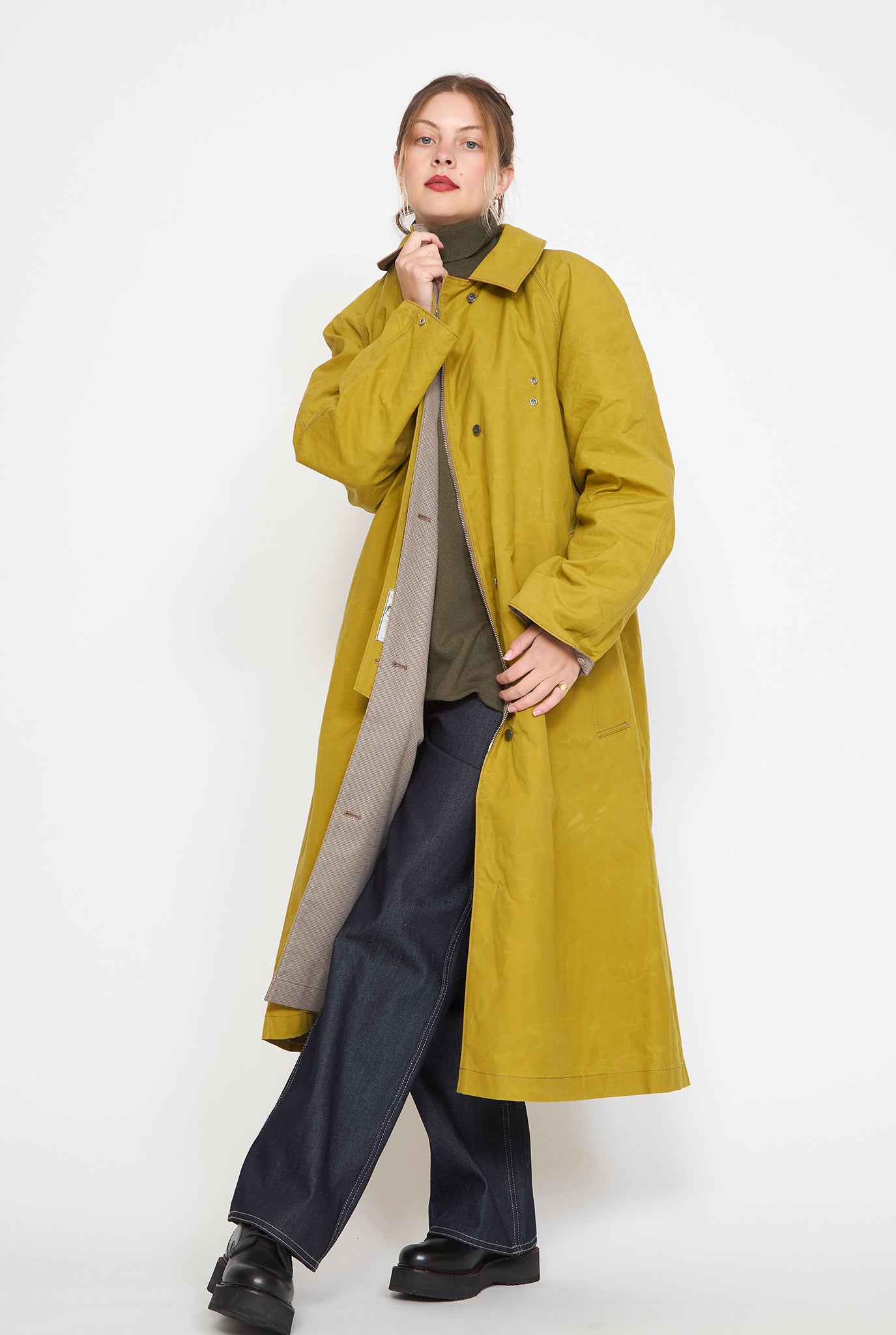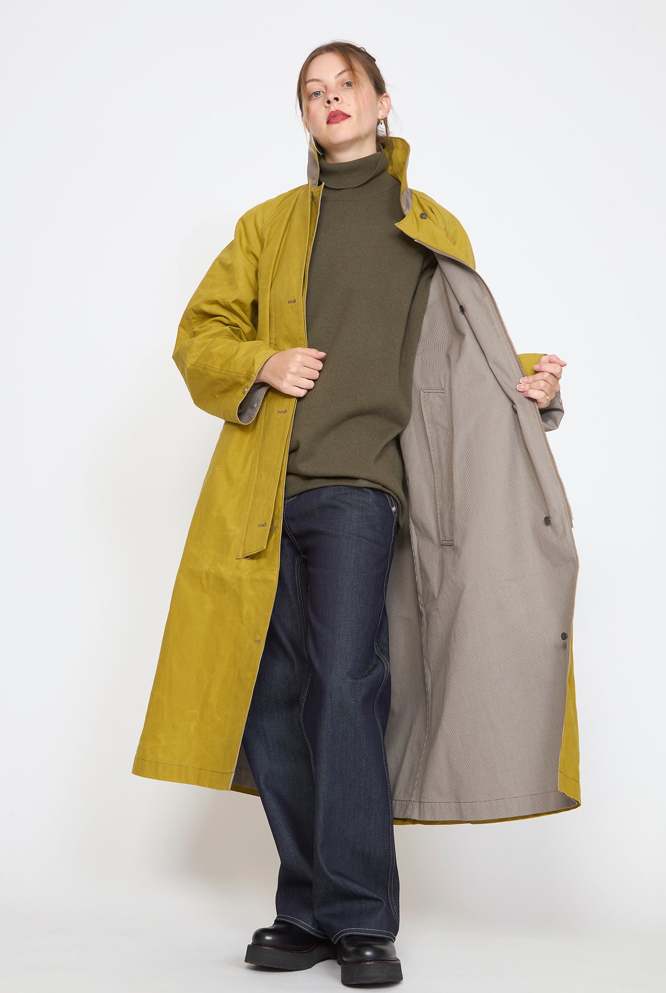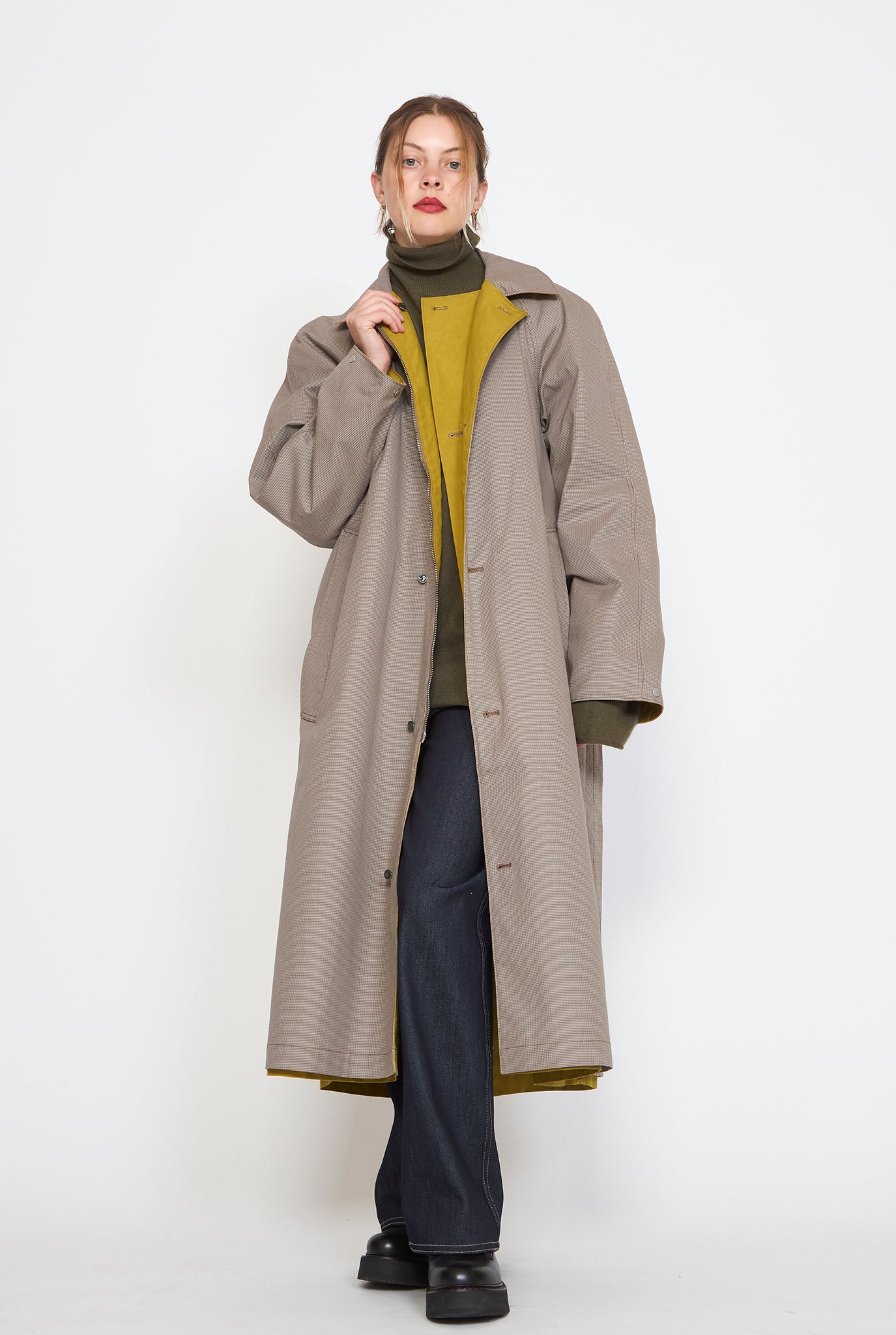 The W'menswear Reversible Cycling Trench is designed to provide both weather resistance and timeless appeal. With a fully reversible design, the coat offers two distinct looks in one—allowing you to effortlessly switch between a rich color or classic herringbone, depending on your mood or the elements. Both sides are water repellent. Other details include air vents, adjustable cuffs, zipper and button closures, and functional pockets on both sides.