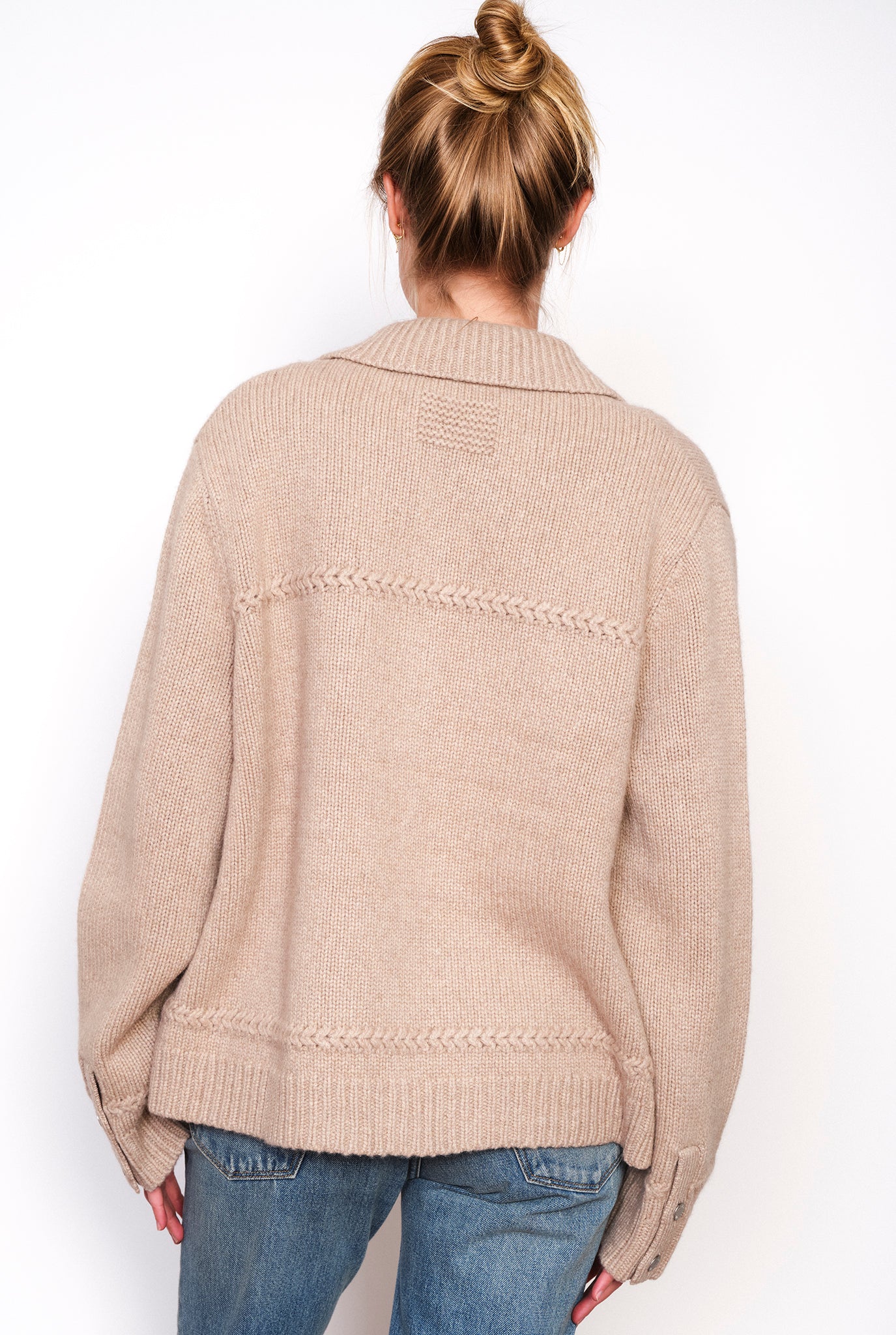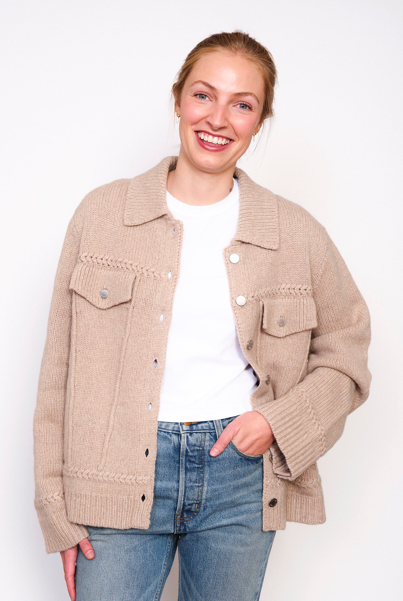 Guest in Residence "Jean" Jacket. Women’s cashmere blend jacket for layering. Heavy-weight jean style jacket with a sculpted welt detailing along the front body. Decorative knit braid detail across the yoke and two Front chest pockets with metal shank buttons. Model is 5'4" and wearing a size Small.