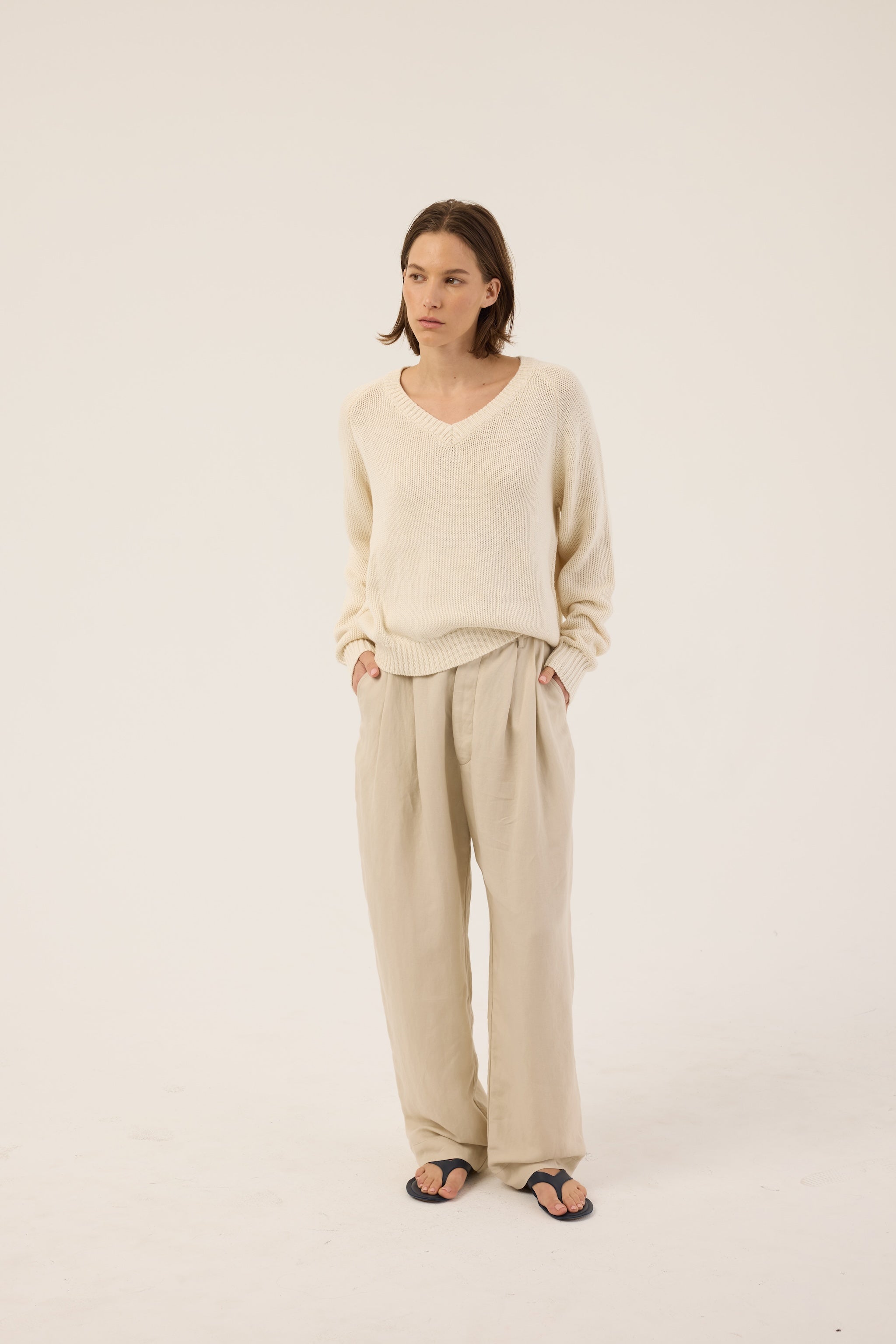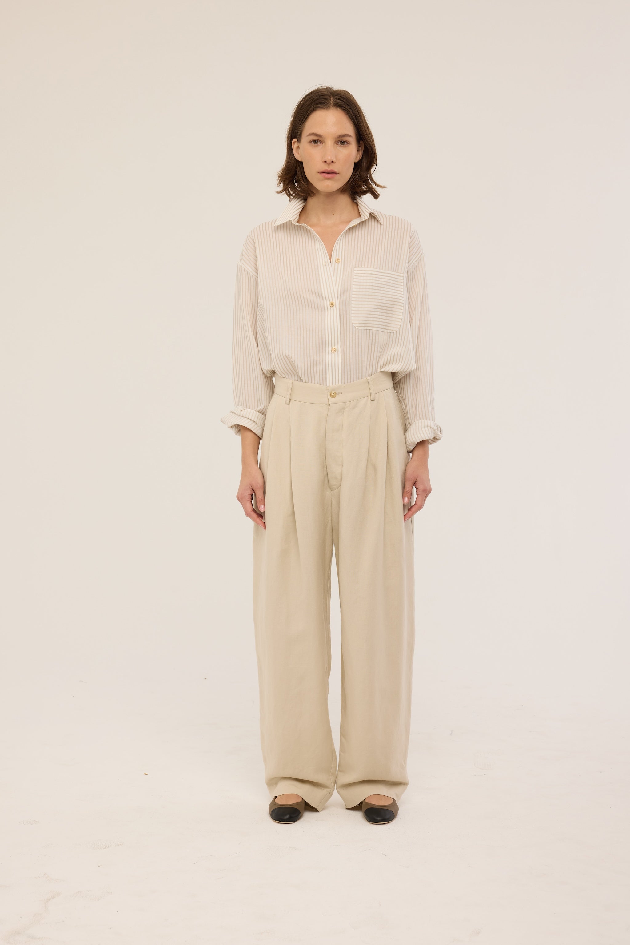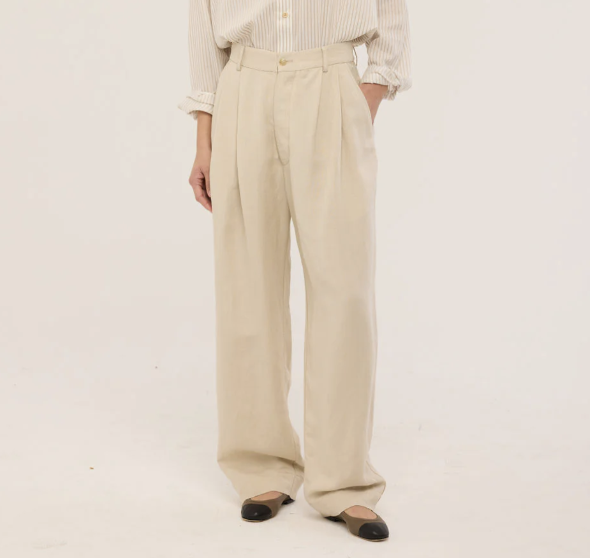 Jamie Haller The Big Pleat Trouser. An ode to baggy and loose with deep pleats and a tapered leg. Embodying casual essence, she’s the type of trouser that you go back to. Perfect with the walking sandal and a tee shirt, acting as a workhorse for days when you need to feel professional and styled. The ideal trouser to walk the line between stylish and everyday. Softly tailored in luxurious Japanese linen.