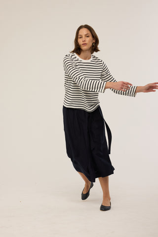 A relaxed skirt, tied at the waist. Inspired by apron styling, long weekends, and Italian summer travel. An elastic back for ultimate ease. Pair it with the walking sandal and weekend shirt for wandering around Tuscany. Tailored in Japanese Linen.